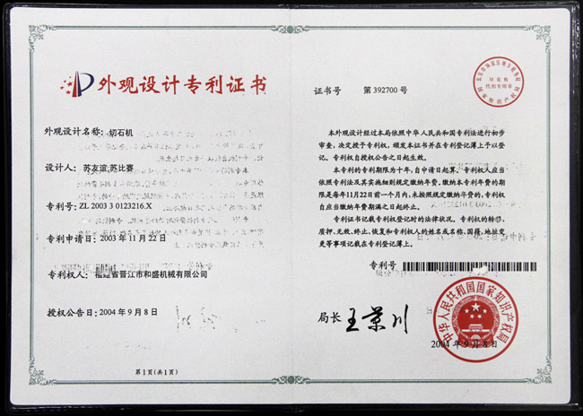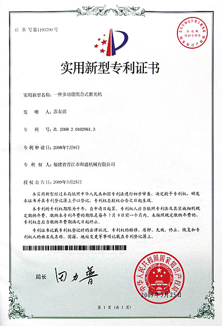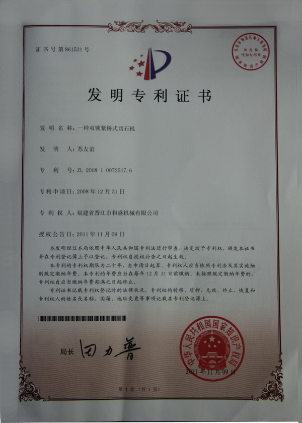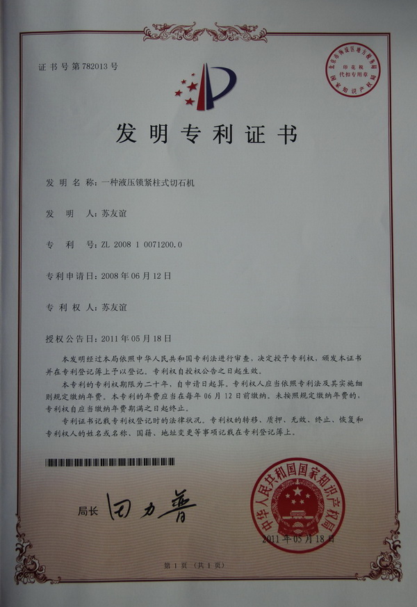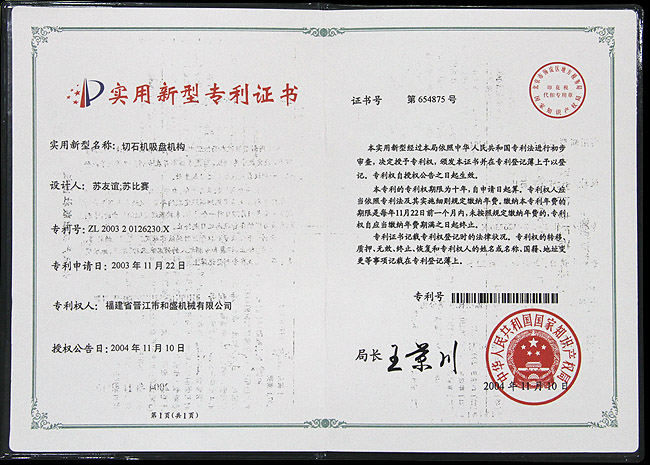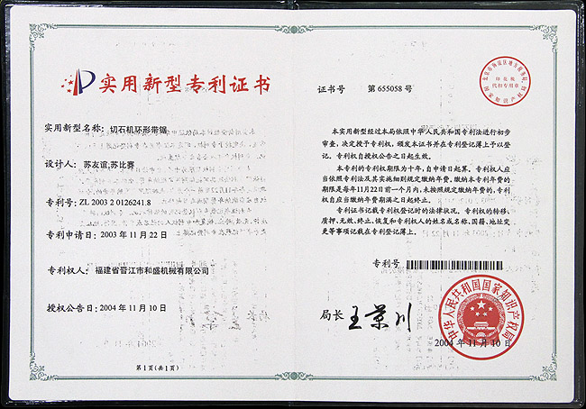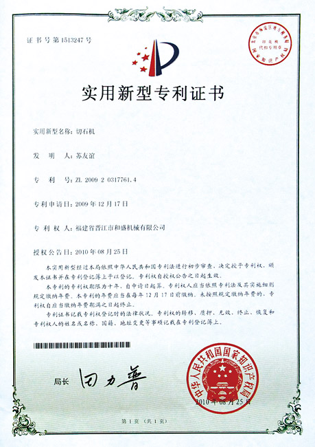 切石機(jī)實(shí)用專利證書